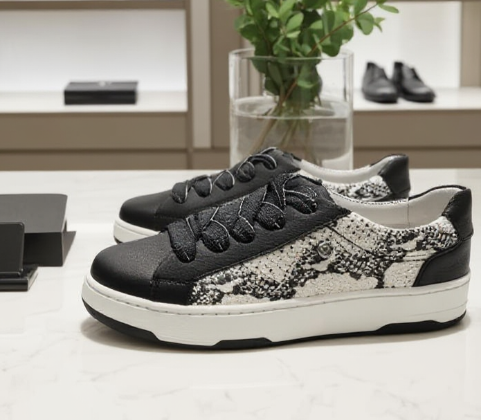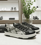 Elevate your everyday look with these Black Leather Sneakers, where classic craftsmanship meets modern design. Made from premium black leather, these sneakers stand out with their printed leather side panels, offering a subtle contrast in texture and pattern that whispers, rather than shouts, individuality. Delicate silver-toned accents are thoughtfully placed to catch the light without overwhelming the minimalist aesthetic — a quiet nod to luxury.