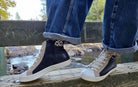 Step up your style game with these bold and trendy high-top sneakers. Featuring a sleek combination of black and beige leather panels, these shoes are elevated with a touch of wild—an eye-catching animal print accent at the collar. The side zipper adds both style and convenience, making them easy to slip on and off. A white rubber sole and contrasting laces complete the urban-chic look.
