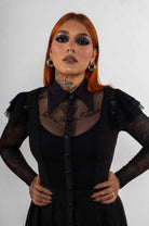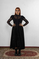 Robe noire en deux pièces (doublure intérieure et robe longue) réalisée dans une combinaison de maille et de dentelle, avec un col, un boutonnage devant, des manches longues avec des liens sur les épaules et une asymétrie entre la longueur devant et dos, le dos étant le plus long.
